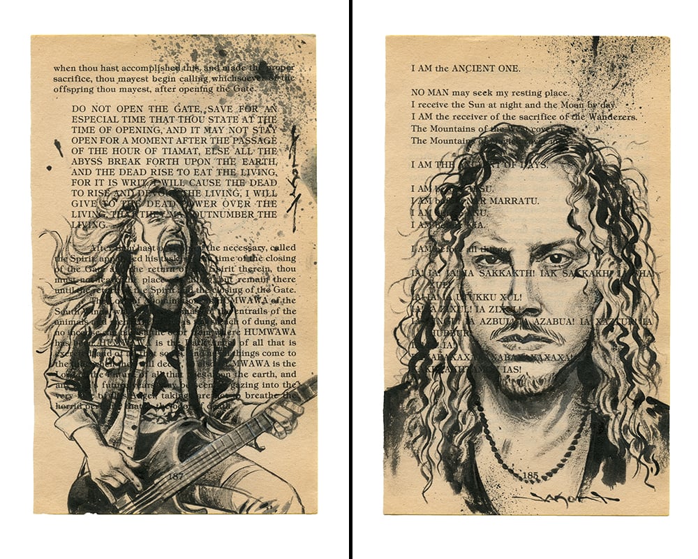 Originally released as black acrylic sketches of the members of Metallica, on vintage Necronomicon pages.