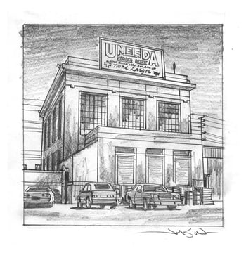 "Uneeda Medical Supplies Warehouse" - 5" x 5" original pencil drawing